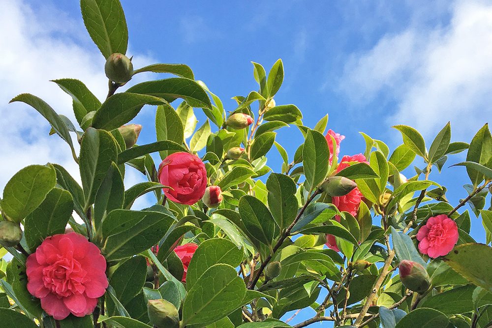 Whenever I see these stunning Camellia blooms, I immediately think ‘Karma Camellia’, with their red petals, gold centres and glossy dark green leaves. Originating from all over Asia there are hundreds of species and thousands of hybrids so not all fall into the red, gold and green format and at this time of year Cornwall is a-pop with a tapestry of pinks, whites and reds too.